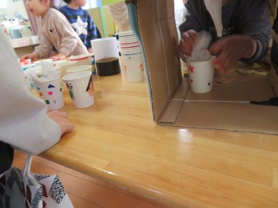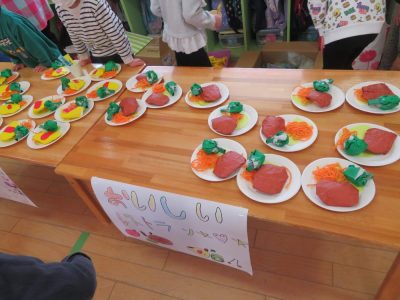 2月28日(火)おみせやさんごっこがありました。3.4.5歳児が縦割りグループを作りどんなものを売りたいか話し合いを行い1ヶ月前から品物を作って開店する日を楽しみにしていました。アクセサリー屋さんやレストラン、ケーキ屋さんなど手作り感満載の商品が店頭に並び「いらっしゃいませ~♪」「おいしいケーキいかがですか~」などと元気な声が響き渡りお客さんも楽しそうに品定めしていました。交替でお客さんとお店の人に分かれて楽しんだのですが年長さんが年下の子を優しくリードしてくれるなど、縦割りならではの微笑ましい場面も見られました。「楽しかったね」「またやりたい!」などという声も聞かれ子ども達は大満足でした。これからも縦割り活動を保育の中に取り入れていきたいと思います。