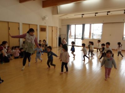 3つ目の「とんぼ」の様子です。とんぼの羽のように両手を伸ばして全速力で走る子ども達!先生達も全力で走りますよ! 「とんぼのメガネ」の曲に合わせ、最後はピタッ!と止まる緩急が楽しいです。