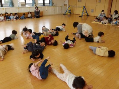 楽しくみんなで踊ったあとは、大好きなリズム遊び!ホールの大きな空間をめいっぱい使って身体を動かしました。種目は①どんぐり②あひる③とんぼ④汽車の4つ。