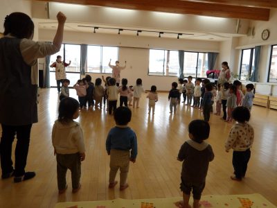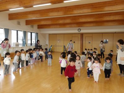 前回の未満児交流会では、運動会ごっこをした子ども達。「今日は何をするかな?」とワクワクしている様子で、すみれ組(0歳児)、すずらん組(1歳児)、たんぽぽ組(2歳児)の子ども達がホールに集まりした。