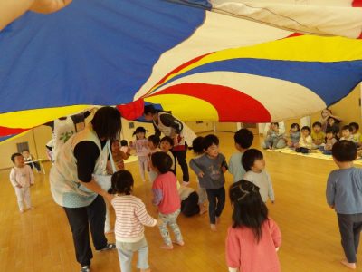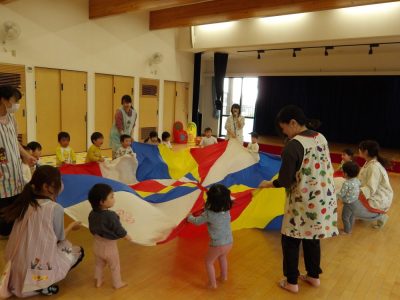 パラバルーン遊びは、バルーンを持ったり、職員が上に上げて中に入ってみたり。始めのうち大きなバルーンを見て驚いていましたが、バルーンのダイナミックな動きを楽しみました。