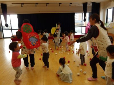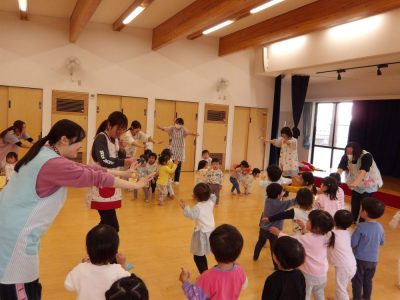未満児3クラスで交流保育を行いました。今回は『運動会ごっこ』をテーマに①遊戯(『かわいいさくらんぼ』)②玉入れ遊び③パラバルーン遊びをしました。『かわいいさくらんぼ』は「チェリービーム!」と言いながら両手を前に伸ばす仕草が可愛らしい遊戯です。